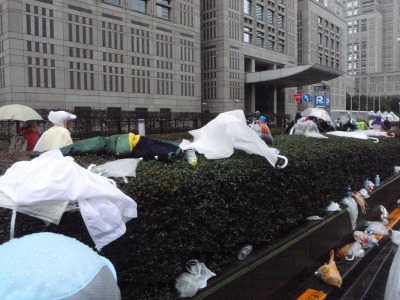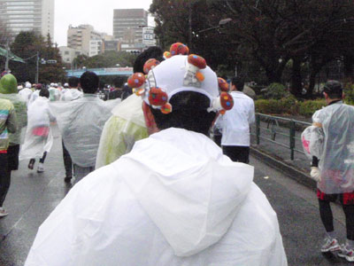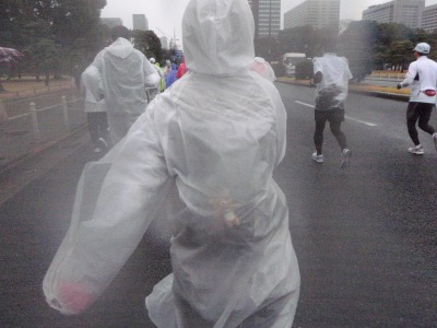 9:19(0:09) そうそう! 東京マラソンスタート時のごみは当然であり、運営側も了解しているようです。 傘についてはスタート5分前位に 『間もなくスタートです!傘をさしてのスタートは危険ですので閉じて隣のランナーへ渡して歩道に捨ててください!!』 との注意があり、スタート後は 『歩道の近くは傘・カッパ・ゴミなどがありますので足元に気を付けてください!!』 という案内があります。 カッパ拾ってこれば良かったかな?(爆) |