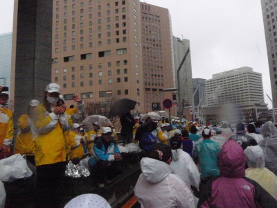 9:58(0:48) とうとう我慢できなくなりトイレへ!! しかしすごい行列です。 冷え切ったところにこの行列!! 足踏みはしてましたがここでヒザが痛くなってきました! 時間は刻々と過ぎていきます。 まだ5キロも走っていない状況でこの足の状態は完走できるものでないと途中棄権が頭の中をよぎります。 寒い寒い寒い・・・・ブルブル この時間で携帯で写真撮ってブログにでもアップしようと思いましたが指がききません!!携帯も雨でぬれてしまうのであきらめました。 |