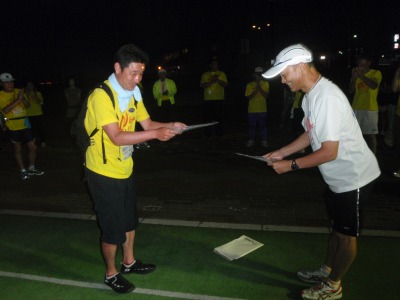 完走パーティに出られない方はここで表彰式を行いました。 ちなみに参加者全員表彰!! そしてこの灼熱の中100km途中バス移動無く走られた方は1名のみおられました!!スバラシイ!!! |