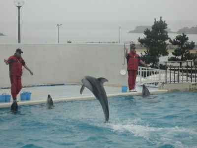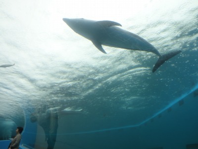 すごい! 外にイルカがいる!! 良く見ると水槽になってるようです!! しかし逃げないのかな?? |