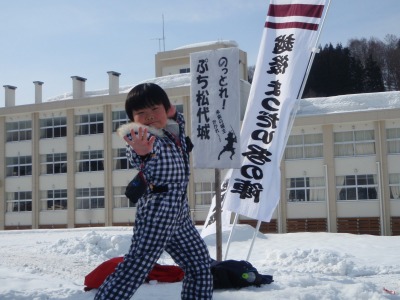 | 朝5:50に目が覚める。 ガス炊飯器のスイッチを入れて風呂の水を抜く。 洗濯1回目を回して、茶色いモフモフの背中に黄色い物体を縫いつける。 風呂を洗い、洗濯2回目を回しつつ1回目の洗濯を物干しに干す。 そんなことはどうでもいい 外は昨日までのYAHOO!天気予報を覆す青空。 あまりの青空に目がくらむ。 そう!今日はのっとれ!松代城 子ども起こして朝飯くって、「8時には出発だぞーっ!」 目標の10分過ぎに出発。(予定通り?) 途中うちの子どもたちに人気の「カービィーにーちゃん」を載せていざ松代へ!! 今年は柏崎市内はあまり雪も積もらなかった。松代はどうだろう? そんな心配はなかった。 車道の雪壁は松代に近づくにつれ高くなり、ゆうに車の高さを越えた。 例年以上の積雪か!? 松代町は雪国ならではの何とも言えない温かい空気がある。 会場近くの車道一部を通行止めとして駐車場とした場所に駐車する。 身長の2,3倍を超える雪壁の下を通りながら会場へ 私は受付の体育館。その間家族は冬の陣会場へ。 体育館を開けるとフロア全体に500個のヘルメット・ゼッケンが整然と等間隔で並んでいる ワクワクが止まらない! 体育館には多くの参加者が準備しており、歌舞伎物参加者も支度を整えている。 とりあえず貴重品だけ持って着替えを自分のゼッケン番号のところにおいて家族のもとへ |